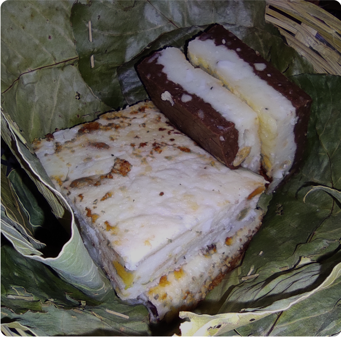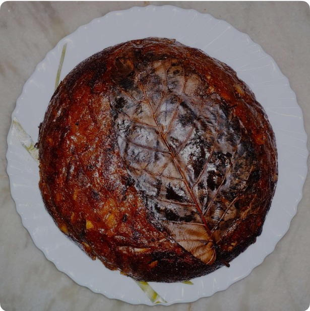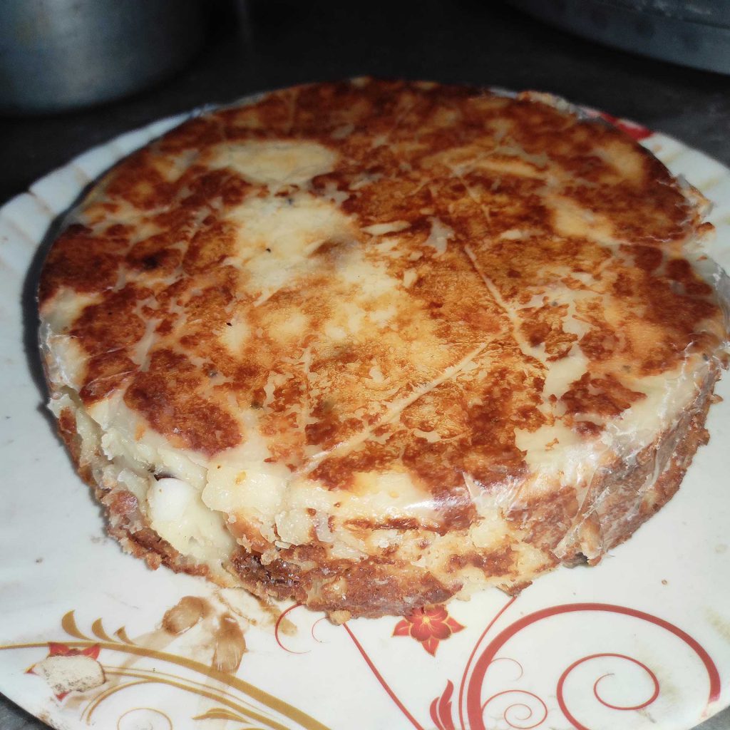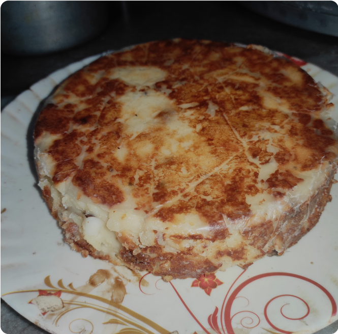 This dish is prepared by combining rice flour, jaggery, black gram, and coconut pitha, then baked until the crust is nicely browned.